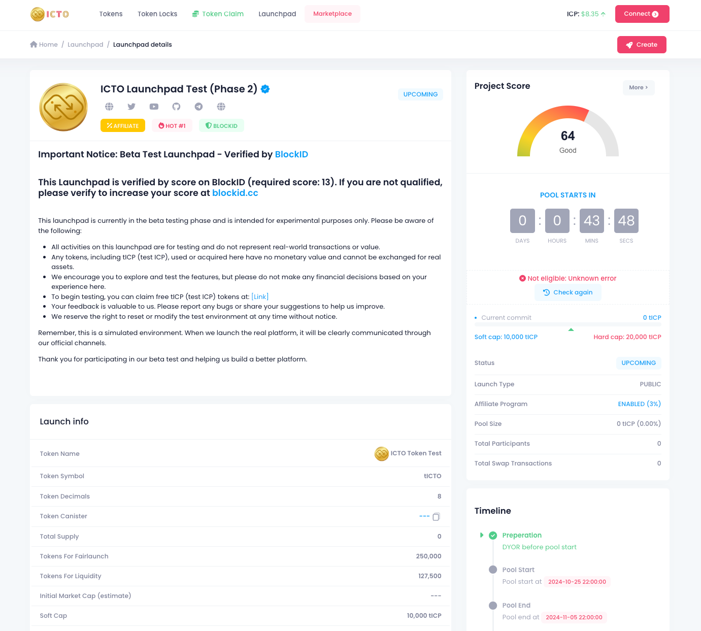 3. **Participate in Launchpad.** Once you have your **tICP** token, you can connect your wallet to Launchpad and start exploring the platform. <https://icto.app/launchpad/2phil-viaaa-aaaap-qhoka-cai>\