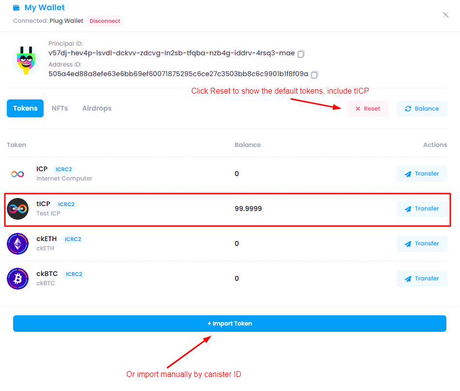 <mark style="color:red;">Check</mark> <mark style="color:red;"></mark><mark style="color:red;">`My Wallet`</mark> <mark style="color:red;"></mark><mark style="color:red;">If you don't see your</mark> <mark style="color:red;"></mark><mark style="color:red;">**tICP**</mark> <mark style="color:red;"></mark><mark style="color:red;">in your wallet</mark>, please click on **Reset** button or import this canister ID to your wallet: **3mj2l-5aaaa-aaaap-qkmfq-cai (ICRC-1)**\ <br>