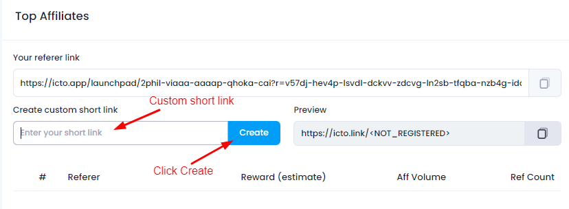 <figure><img src="https://1338744419-files.gitbook.io/~/files/v0/b/gitbook-x-prod.appspot.com/o/spaces%2Fzp6fSpb3vLC0X7L5f45h%2Fuploads%2FU6vPMsRmSV80ZEEPeVlv%2FScreenshot%20(32).png?alt=media&#x26;token=8b2bce3d-0af4-44e5-a41e-2539b757427b" alt=""><figcaption><p>Create a custom short link<br><br></p></figcaption></figure>